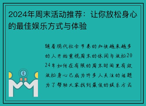 随着现代社会节奏的加快,越来越多的人开始重视周末的休闲与放松。2024年,如何在有限的周末时间里有效放松身心,已成为许多人关注的话题。为了帮助大家找到最佳的娱乐方式,本文将从四个方面详细推荐2024年...